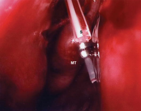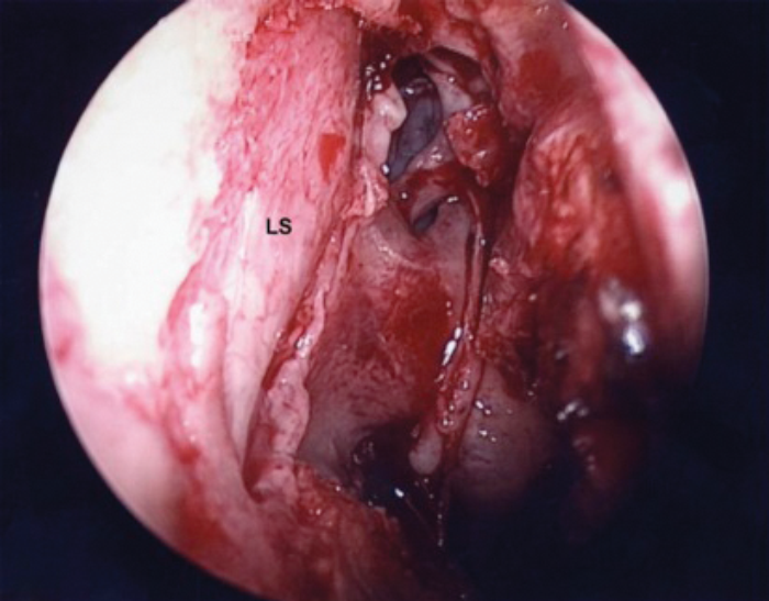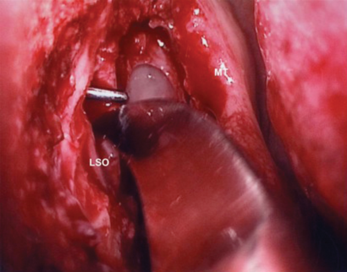 Figure 1. Mucosal incision in the lateral wall 8mm above, 8mm anterior to middle turbinate.