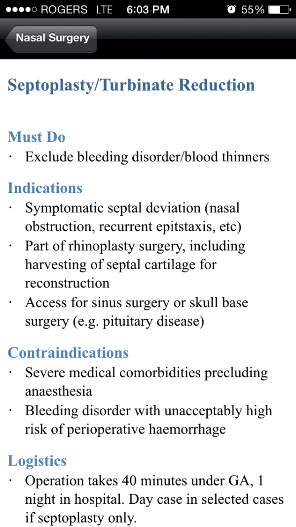 The content within ENT Handbook is focused and practical. For example, every listing within the ‘Common operations’ category includes an outline of the procedure, indications and contraindications, must-do steps, logistics, risks to go over with the patient, guidance for post-operative care, and discharge orders. Medical trainees will no doubt appreciate that the information is laid out in such a logical fashion.