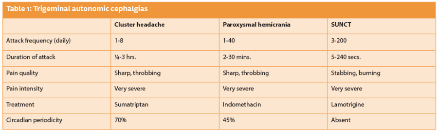 These are a group of neuralgias which typically cause recurrent lancinating pain over the ophthalmic branch of the trigeminal nerve and almost always are associated with autonomic symptoms including ipsilateral tearing, nasal discharge, ptosis and miosis. They consist of three types: cluster headaches, paroxysmal hemicranias, SUNCT and SUNA (Table 1).