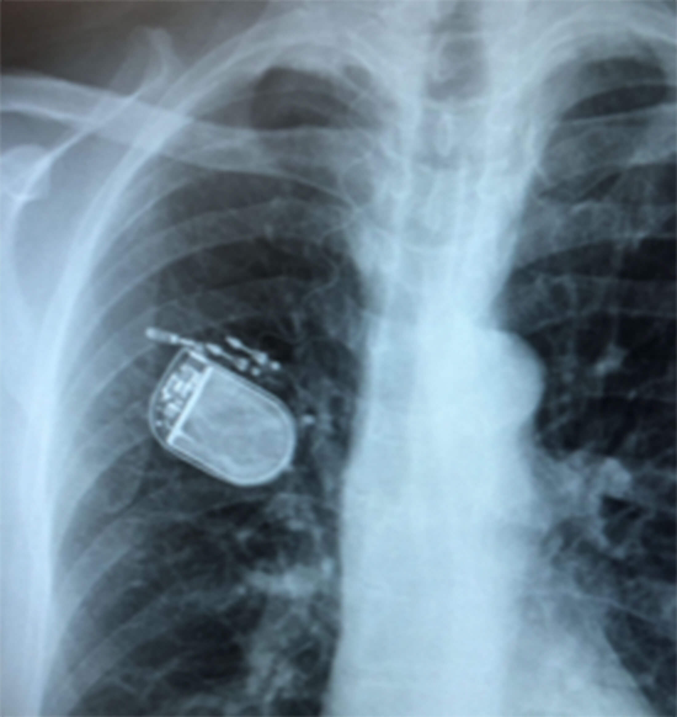 Figure 3b. Postop chest X-Ray showing the pulse generator in situ.