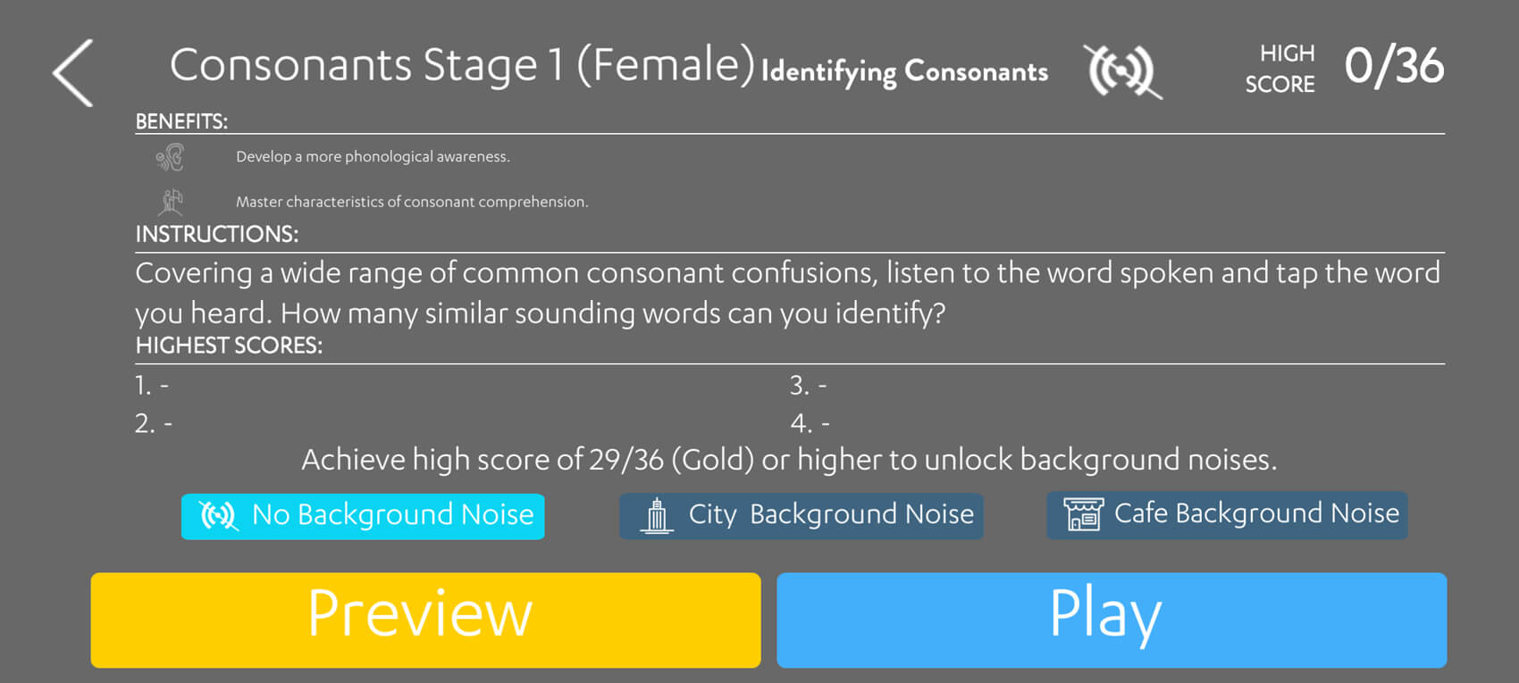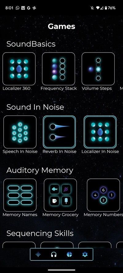 Designed by audiologists in the UK, this app jumps right in with a ‘hearing test’ which was an appreciated addition. Though it was more a screening for a signal-to-noise ratio loss, they do consequently link to information regarding full audiological assessment. The activities focus on discrimination of sound intensity and frequency, environmental sound identification as well as auditory memory while listening to noise. This is another great app with engaging visuals and a comprehensive and easy-to-follow dashboard. Resources regarding hearing health are also offered. I found their ‘Busy Barista’ game an excellent exercise that challenges you to follow instructions with environmental noise, which reflects realistic conversation scenarios. However, I think the app would be altogether more useful if the other activities also used speech stimuli. A small one-time payment is necessary to unlock the full version.