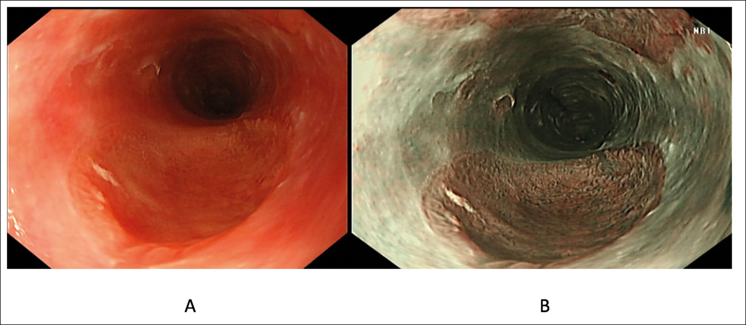 Figure 1. An inlet patch in the proximal oesophagus assessed in white light (A) and narrow band imaging (B).