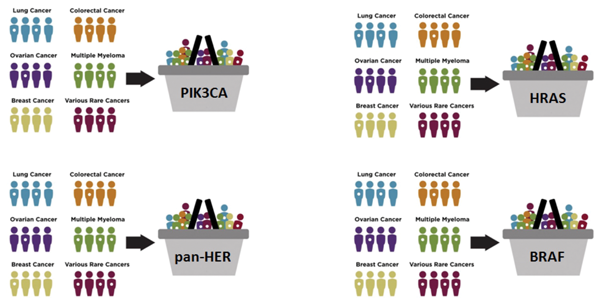 Clinical trials in precision oncology will rely heavily on “basket studies” defined by molecular alterations, rather than cancer type