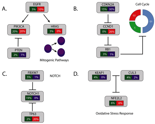 Figure 1: Common alterations in selected pathways in HNSCC. Green: Frequency of mutations. Red: Frequency of amplification. Blue: Frequency of deletion. (A) Mitogenic pathway alterations. (B) Cell cycle alterations. (C) NOTCH signaling. (D) Oxidative stress response.
