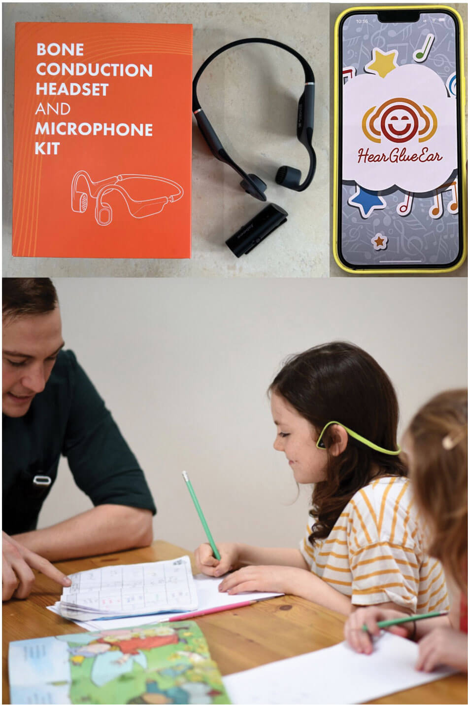 The Hear Glue Ear headset, accessory microphone and Hear Glue Ear app.