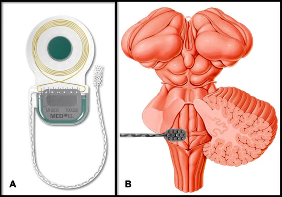 In the presence of contralateral severe-to-profound hearing loss or when surgical excision of a VS will inevitably occur in the opposite side (in NF2), simple rerouting of sound becomes inappropriate. Furthermore, in the absence of an implantable cochlea or when a cochlear nerve is non-functional or absent after surgical removal of a VS, CI is not an option. Under these circumstances the only way to potentially restore some auditory stimulation is with an auditory brainstem implant (ABI; see Figure 4). This type of auditory implant was first described in 1979 by Drs William House and William Hitselberger. Surgery was performed on a 51-year-old female patient with NF2.