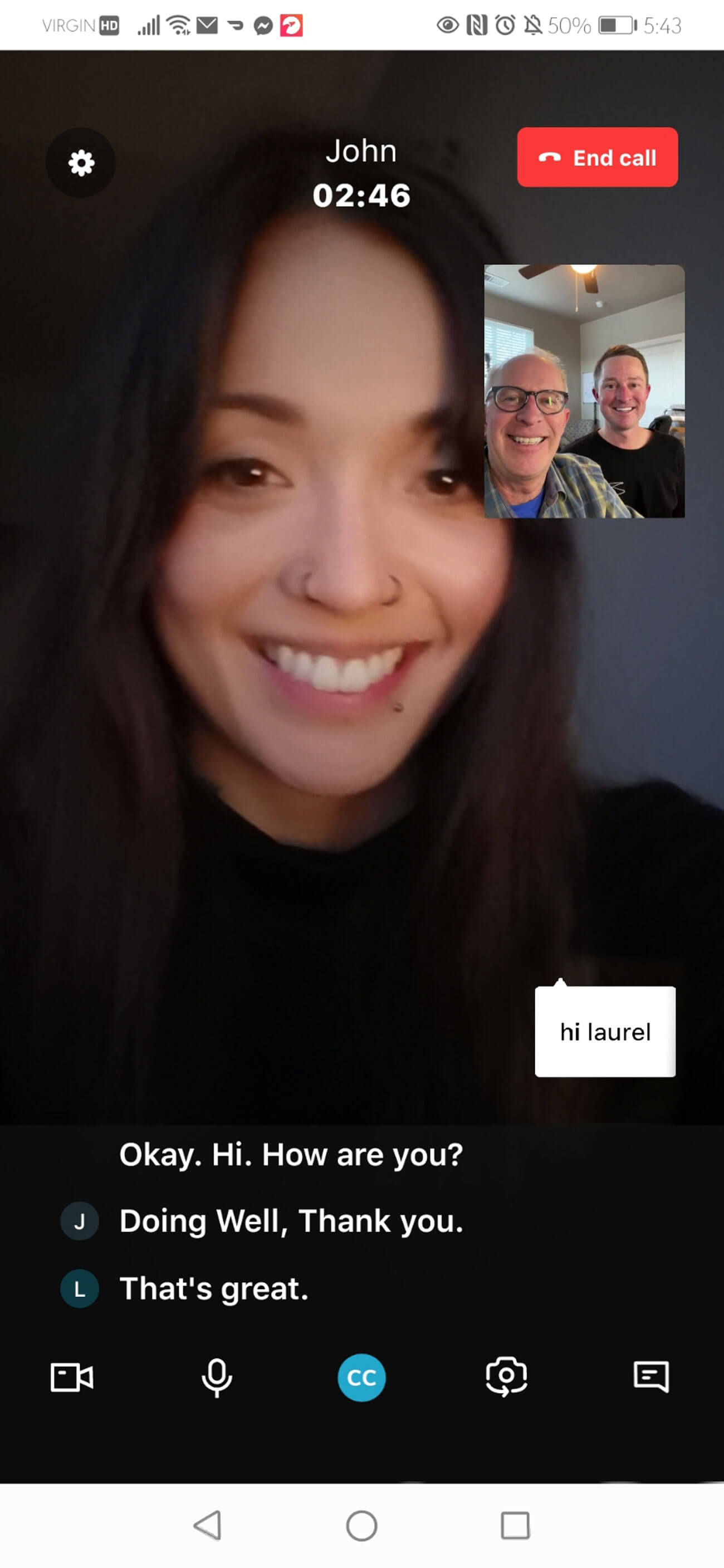 In terms of functionality, the video quality is good with no noticeable lag. Captions are largely accurate and are comparable with other apps that I have tried with adequate speech-to-text capabilities. Any errors were typically minor and did not obstruct the intended message. Background noise did not infringe on captioning when tested in restaurant noise, although a loud, nearby speaker did. Bluetooth headphones remediate this problem; however, amplification users may have variable experiences depending on whether their devices use built-in microphones or phone microphones for streaming calls. Speech from multiple conversation partners on one end of the call are sufficiently parsed, but the captions can become hard to keep up with. One key drawback is that chat transcription is not available for review once the call ends, though this seems to be due to privacy concerns.