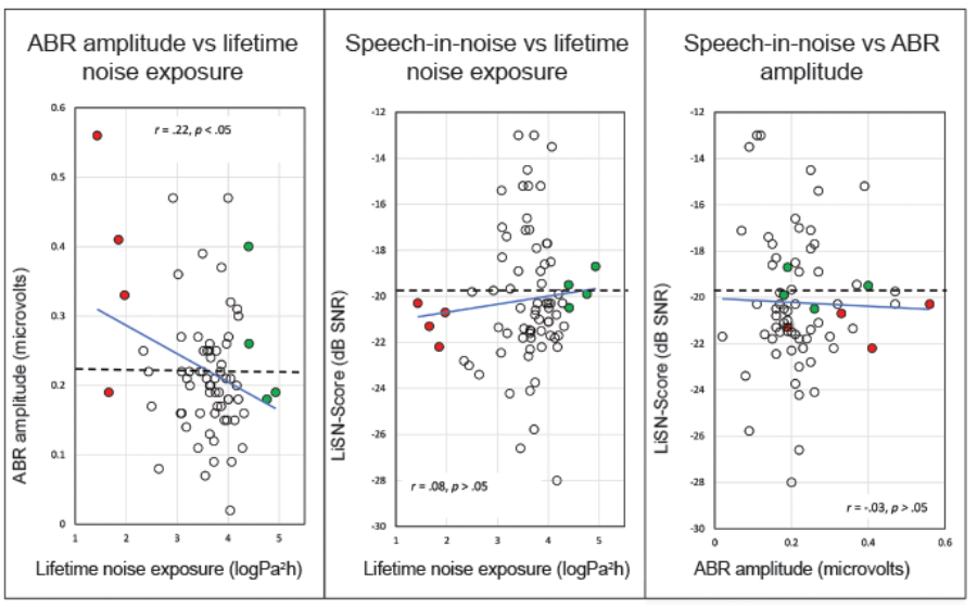 Figure 1. Panel A: ABR amplitude vs lifetime noise exposure. Panel B: Speech-in-noise versus lifetime noise exposure. Panel C: Speech-in-noise versus ABR amplitude. Dotted black lines indicate the mean, blue lines indicate linear trends. Red data points: four subjects with lowest noise exposure. Green data points: four subjects with highest noise exposure.
