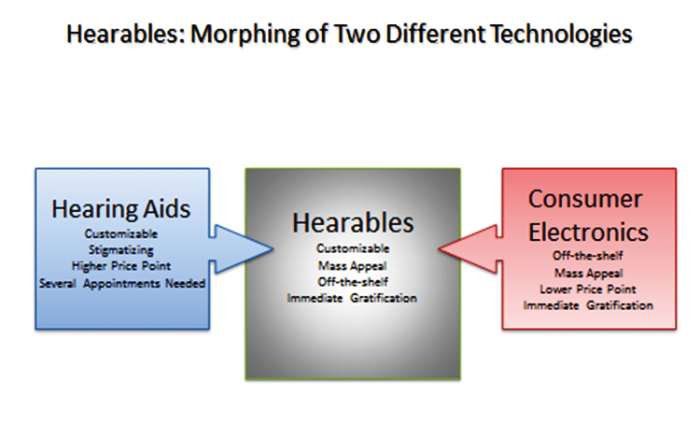 The morphing of traditional hearing aids and consumer electronic devices into a new category of devices, called hearables, provide the business savvy clinician with part of the answer to this question. Hearables provide an opportunity to address the needs of those patient categories listed above who often live with the real world effects of hearing loss, but fail to seek help. Hearables are a broad category of products, comprised of personal sound amplification products (PSAPs), smartphone apps (e.g. EarMachine), wearable augmented reality devices (e.g. Doppler Labs) and directed audio devices (e.g. Hypersound). All of these hearables offer some combination of features from both traditional hearing aids and consumer electronic devices, as per Figure 1.