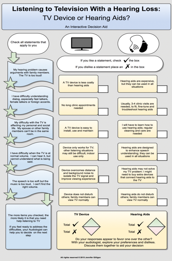 An arms-length transaction necessitates the need for an interactive website where patients can self-assess their functional communication ability using a computerised and validated questionnaire, such as the abbreviated version of the Hearing Handicap Inventory. This website would also have Patient Decision Aids (PDAs), like the one shown in Figure 2, which consumers could use to make their own decisions about products to try.