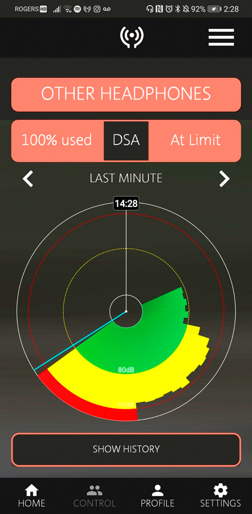 Android users also have the ability to monitor their noise exposure through an app called HearAngel. The app, which is still in development, is available for free at the Google Play Store. HearAngel monitors headphone use and compares the sound levels to a daily sound allowance (DSA). It uses a dose allowance of 85dBA (average level) for an eight-hour period based on Health and Safety Executive (UK) recommendations [4]. To use the app, the user simply has to select the type of headphones they want to use and the app will automatically start collecting data for their DSA once audio streaming commences. The app allows users to monitor their dose themselves, or they can use an automatic feature that adjusts listening levels throughout the day. Automatic settings can be adjusted based on level, DSA and time parameters to keep listeners within their preferred dose limits. If the user chooses, the app will send push notifications to warn the user when they are close to, or have reached, their DSA. Another notable feature of the app is the parental control settings, which allows parents to monitor and limit the sound levels on their children’s devices using a PIN code. The app is calibrated for a variety of different types of headphones/earbuds from multiple manufacturers.