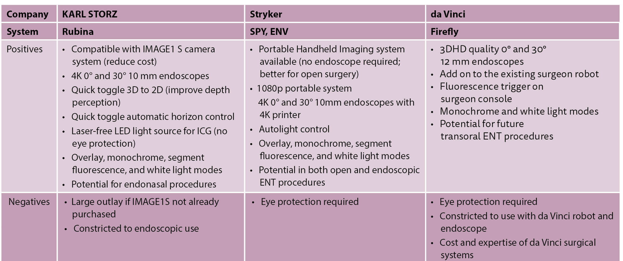 Currently, this technology is possible with hardware from multiple companies such as KARL STORZ (Rubina), Stryker (SPY, ENV; endoscopic near infrared visualisation), and da Vinci (Firefly). All of these companies use high-quality endoscopes that are capable of capturing high-definition images in white light, alongside fluorescence detecting modes. STORZ and Stryker have an additional overlay mode where ICG detection can be superimposed onto white light images. Notably, the Rubina system is compatible with existing IMAGE1 S camera systems which could reduce the overall cost of purchase. However, Stryker’s Portable Handheld Imager (PHI) allows for 1080p fluorescence imaging without an endoscope, which would be more appropriate for open surgery such as in thyroidectomy.