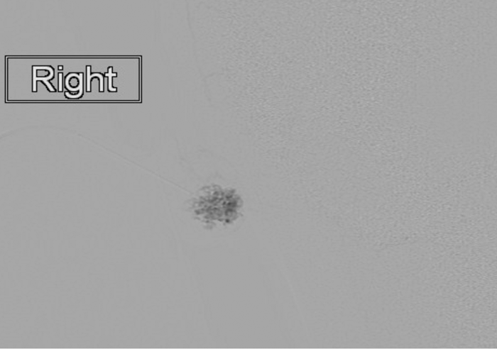 Figure 4: Static image (same patient as figure 3) from a digital subtraction venogram obtained via a percutaneous needle within the right pinna venous malformation demonstrating a characteristic appearance and no significant draining veins. This image is typical of a low-flow venous malformation, prior to the injection of a sclerosant.