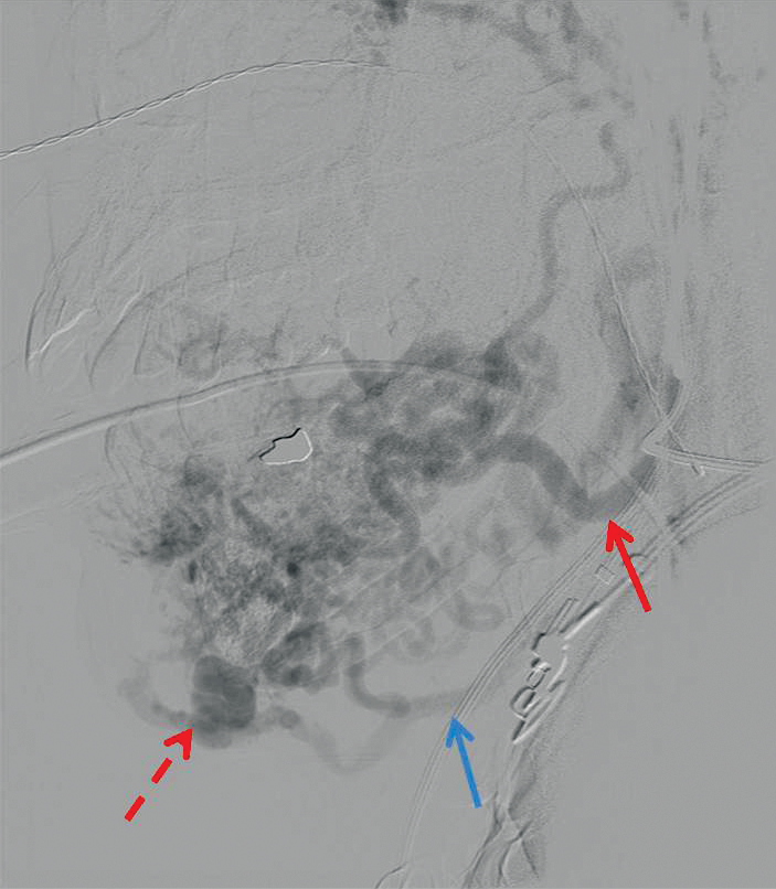 Figure 5: Arteriovenous malformation of lip / chin. Simultaneous arterial and venous opacification of facial artery and vein on digital subtraction angiography (read and blue arrows respectively) representing ‘shunting’. The nidus is the ‘heart’ of the lesion and occlusion of this is required for successful treatment (broken arrow).