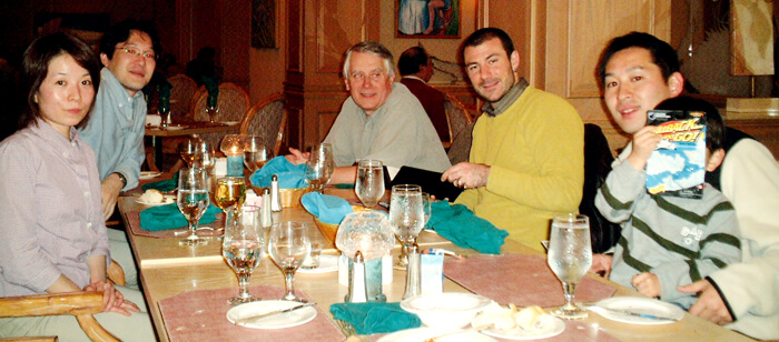 Jos Eggermont enjoying dinner with some of the postdocs from his lab at the 26th Midwinter Research Meeting of the Association for Research in Otolaryngology, Daytona Beach, Florida, USA.