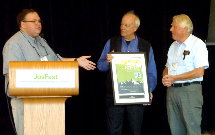 L-R: Steve Lomber (Conference Chair), Larry Roberts (JosFest Chair) and Jos Eggermont at the JosFest Symposium of the 6th International Conference on Auditory Cortex in Banff, Canada, 10 September 2017.