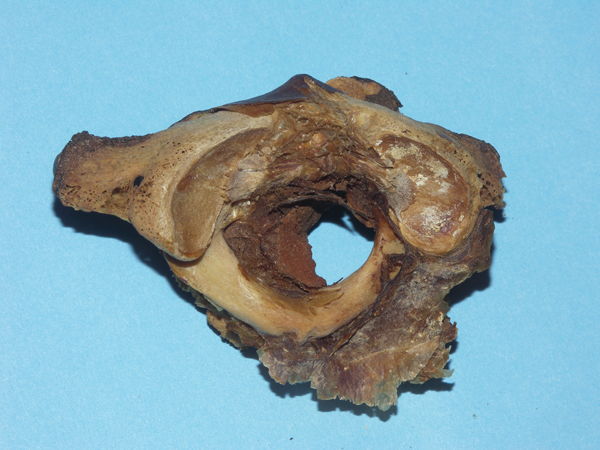 • In a pre-Columbian mummy head and atlas and epistropheus from Cahuachi in southern Peru (between120 to 750 AD), I found a bulging dry brownish mass that reduced the lumen of the upper spinal canal together with the dislocated C1/C2 transition (Institute of Anthropology, Munich). We identified a ‘fresh’ epidural haematoma in the upper cervical spinal canal extending into the skull cavity, obviously due to rupture of the left vertebral artery at its transition between atlas and skullbase. Dry blood more than 1200 years old!