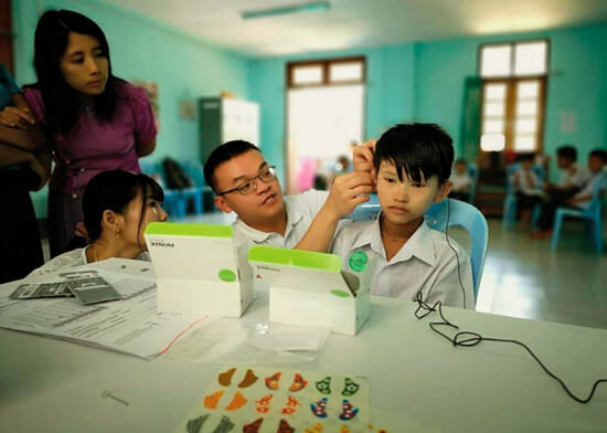 A child being fitted with hearing aids at The Yangon School for the Deaf, Myanmar.