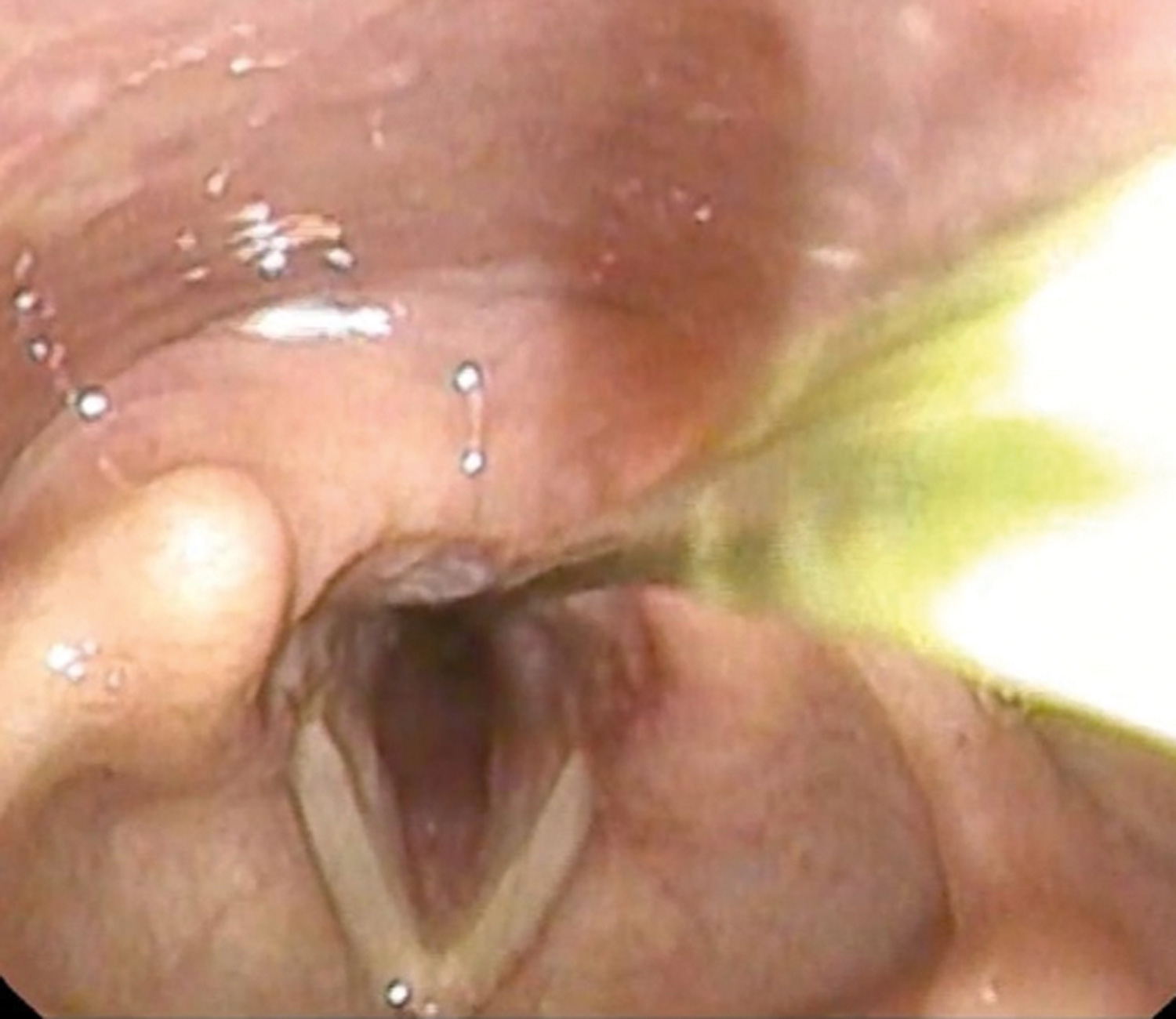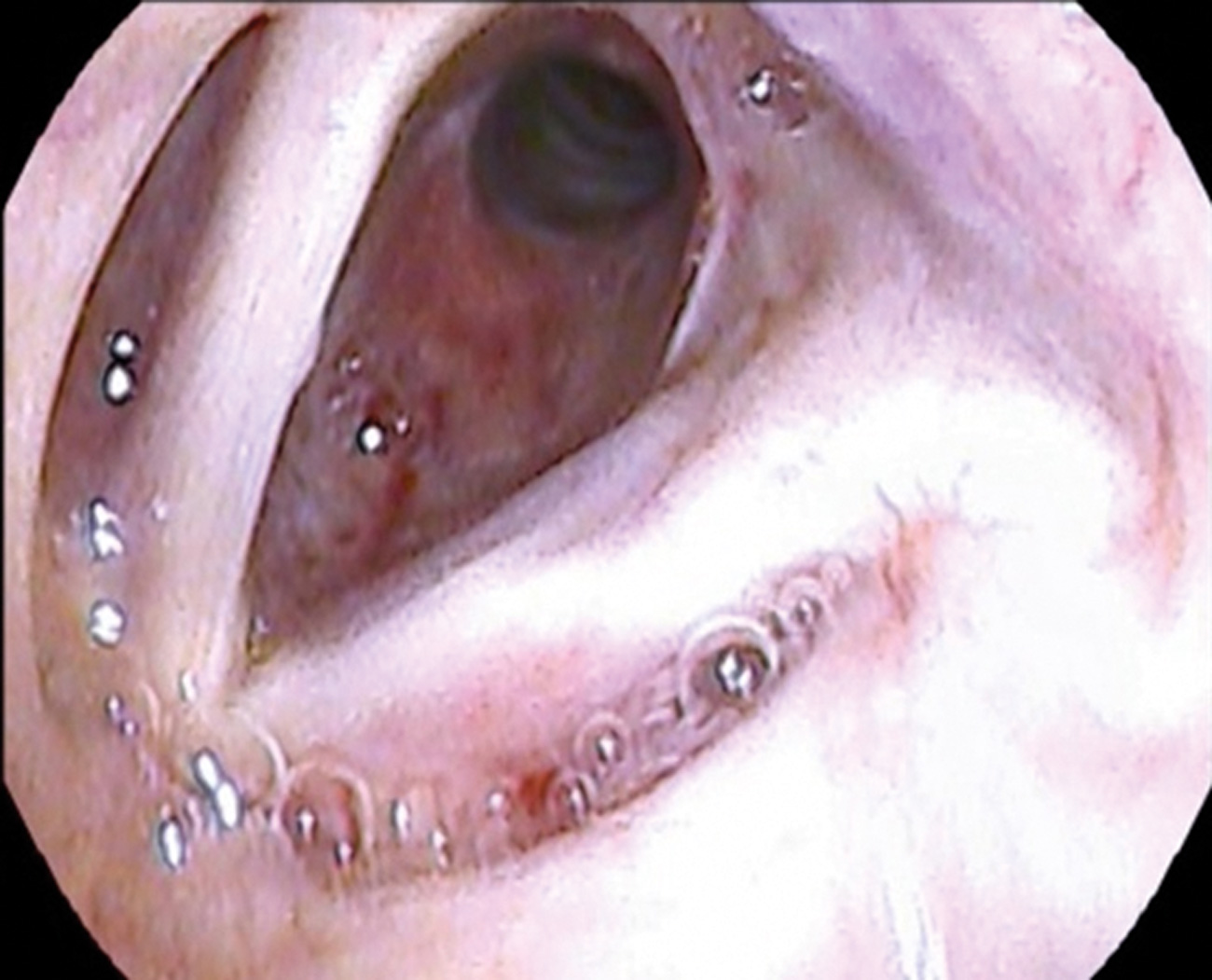 For subglottic lesions, depending on the site of scar, a 23G needle for instance, bent at ~45°, is introduced through the cricothyroid membrane. Under endoscopic guidance, 1-2 ml of a long-acting steroid (e.g. triamcinolone 10 mg / ml or depomedrone 40 mg / ml) is injected at multiple points around the scar circumference (Figure 5).