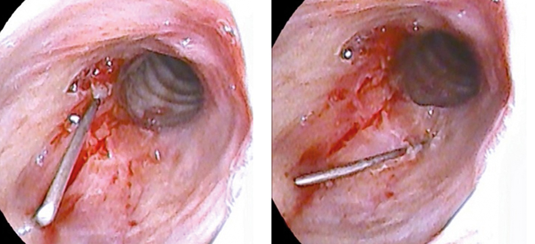 - Guidewire placement: Under endoscopic guidance, the guidewire (diameter: 0.89 mm) is passed through the working channel of the endoscope across the stenotic segment. The endoscope is then removed, leaving the wire in situ.