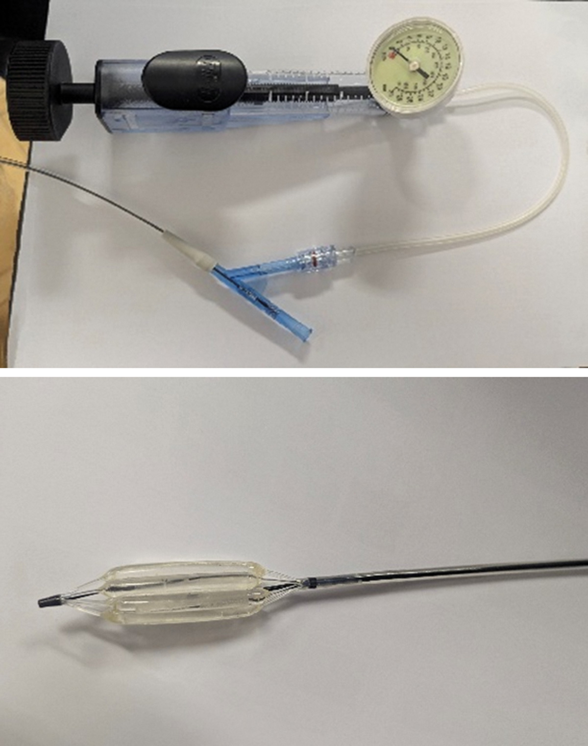(b) A Trachealator® balloon with its proximal end attached to a pressure pump and fully inflated.