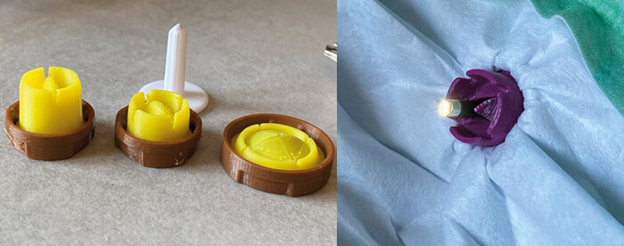 Figure 3. Left shows a range of valve designs to establish the effect of valve length and diameter on the buckling of the flexiscope. Right shows the optimised solution being functionally tested on a mask.