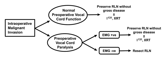 When IONM reveals significant partial EMG activity in an RLN that is invaded by malignancy and presenting with preoperative vocal cord paralysis (VCP), the surgeon realises the functional consequences of resecting such a nerve. For instance, additional dysphagia and aspiration; postoperatively, the patient should be informed accordingly. Sometimes, surgical management of RLN invaded by tumour can be impacted by intraoperative EMG activity (see Figure 2).
