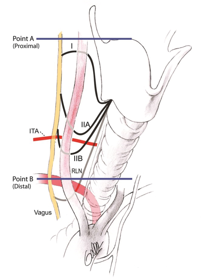 Figure 3: Anatomical types of NRLN (I, IIA and IIB) and IONM algorithm for NRLN detection: The proximal [A] and distal [B] points of vagal stimulation applied for NRLN detection - Point A: at the level of superior border of thyroid cartilage and point B: at the level of inferior border of fourth tracheal ring ITA = Inferior thyroid artery, RLN = Recurrent laryngeal nerve, NRLN = non-recurrent laryngeal.