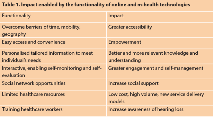 There are numerous ways in which m- and e-health applications can improve hearing healthcare (see Table 1). These can lead to increased accessibility to healthcare, greater knowledge and understanding, increased user engagement and self-management of long-term conditions, and low-cost, high-volume delivery of interventions; all of which will contribute to future development of new service delivery models for hearing healthcare.