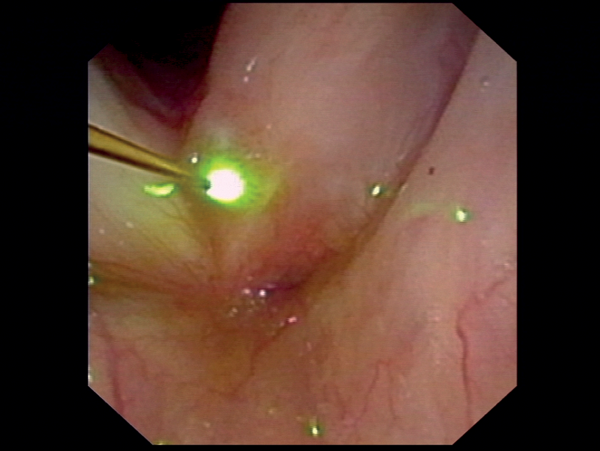 With a 400µm glass fibre routed through the working channel of an endoscope, plume and secretions can be simultaneously suctioned during the in-office procedure. In cases of hypersalivation, excessive secretions can cover lesions and surgery cannot be continued. In patients with RRP, suction of plume is recommended to reduce viral spread with aerosols.