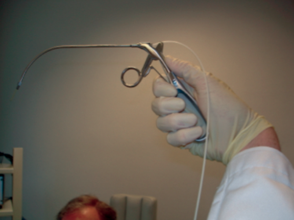 Figure 2: Bent cannula for routing KTP laser glass fibre into the larynx in indirect transoral laser surgery.
