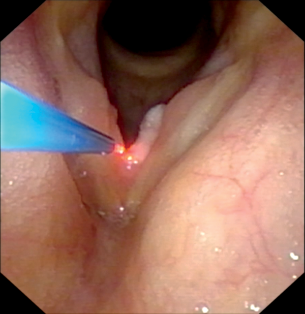 Treatment of RRP is a thankful indication for KTP laser surgery. Papilloma have capillary loops that respond well to pulsed noncontact laser coagulation - selective photoangiolysis. It is a tremendous advantage that KTP laser beams can penetrate several millimetres deep into non-vascular tissue and are able to selectively coagulate feeding vessels. This results in delayed fall-off of nonvital, involuted cells. We use a staggered glass fibrer advancement approach to get closer and closer to the papilloma surface, without touching it, while pulsing the KTP laser. Blanching of the surface mostly indicates that enough energy was delivered. Blanching is a combination of (superficial and deep) vessel photoangiolysis as well as a soft epithelial coagulation. KTP lasering is our first choice for treatment of papilloma within the anterior commissure because of its low risk of web formation. Of course, papilloma can also be coagulated in contact mode. The effect would resemble cutting lasers or radiofrequency heating with a needle.