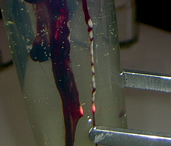 Figure 6: Blood strands within egg white in a glass test tube. KTP laser travels through glass test tube and egg white. All energy absorbed at blood, which coagulates immediately.