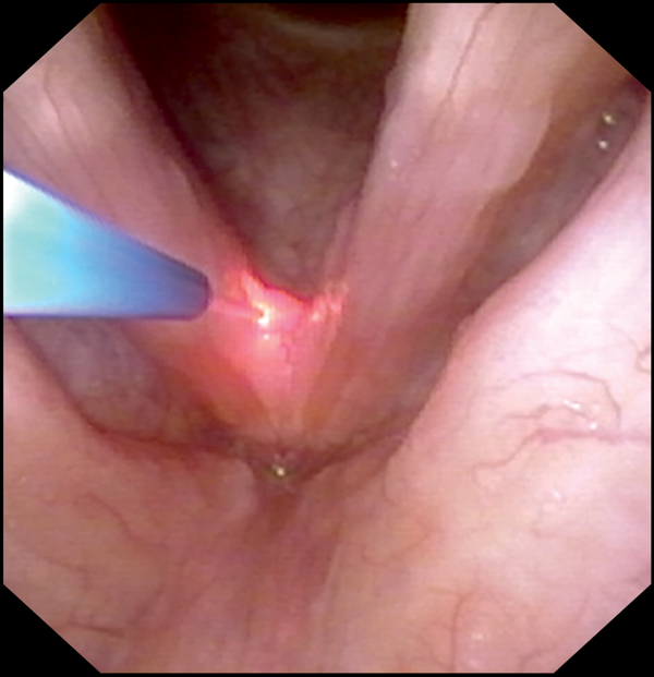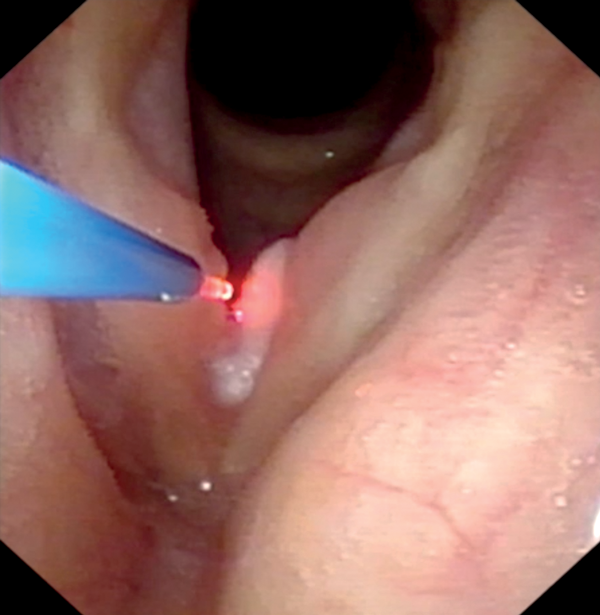 The KTP laser is placed next to the endoscopy unit slightly behind the surgeon, and is controlled by a nurse. The laser pulses are activated by the surgeon via foot pedal. In transnasal interventions, the surgeon advances the flexible endoscope transnasally after topical anesthetisation of the upper airway with lidocaine 4%. Additional dripping of 1ml lidocaine 4% into the endolarynx through the instrument channel helps to suppress gag responses.