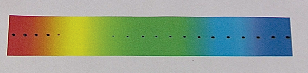 Figure 5: KTP pulses on spectrally coloured paper (with hand piece, equal distances between pulse applications on paper along the spectrum, each pulse with 8 W, 100 ms duty cycle). Notice that yellow colour does not pick up energy, green only a little bit. Red and blue areas are carbonised.
