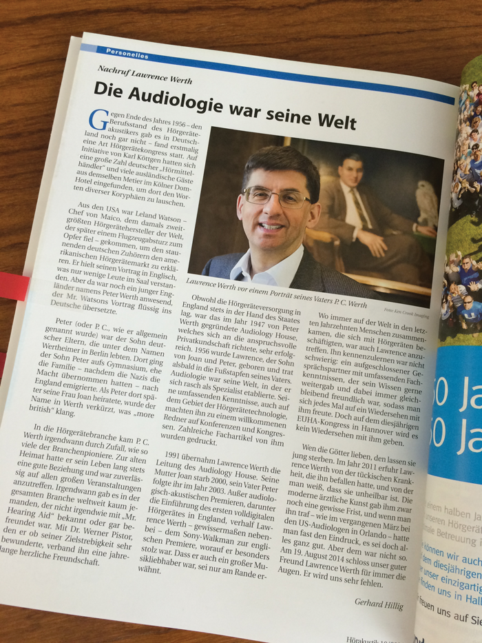 In August the audiology community was saddened to learn that Lawrence Werth (57), Chairman of PC Werth Ltd, London had passed away after a brave battle with skin cancer. A prolific contributor to this magazine over the years, he is remembered here by friends and colleagues who reflect on his unique personality and his contribution to the hearing care community.