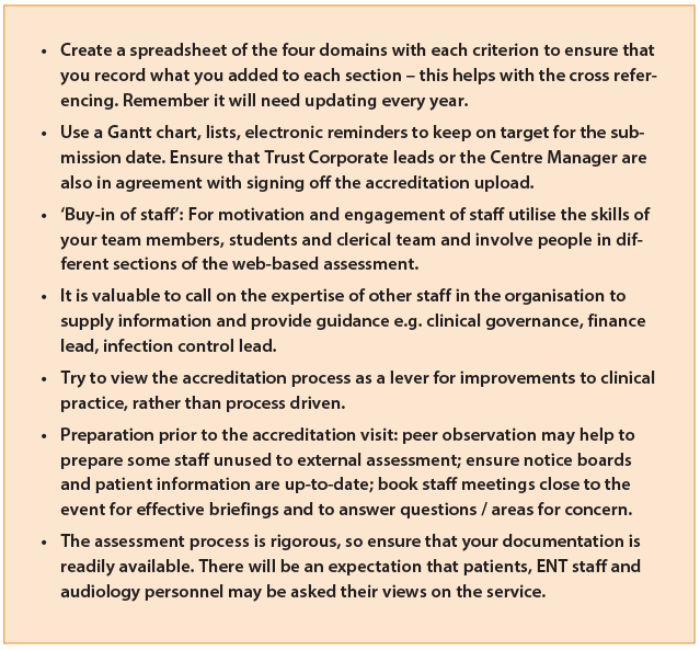 NHS providers can also get accredited for complex work including tinnitus, vestibular and paediatric services. Clear standards and specific examples of what evidence the assessors expected were useful within the web-based tool, but can only be viewed once payment and access to the website has been approved. Preparing for accreditation was a source of stress, whilst trying to balance the day job and the usual clinical demands.