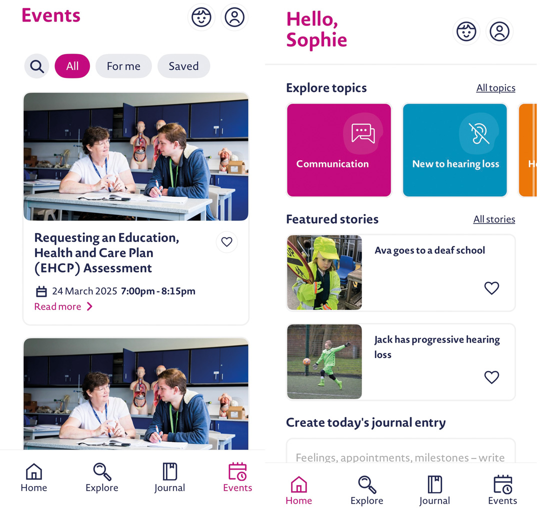 Upon registration, the app adopts a personalised approach to understand your child’s diagnosis. Once registered, it proves to be exceptionally user-friendly, offering a variety of easily digestible content. The app is straightforward to navigate, highlighting areas such as educational information, family stories, a glossary, community events and journaling. The integration of these topics allows families to access additional relevant information effortlessly. Furthermore, the app covers many topics that provide guidance that is applicable throughout childhood and teenage years. It also customises the information relevant to you, based on the degree and cause of hearing impairment and the stage at which the hearing loss was identified.