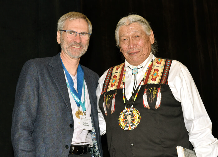 Brian Westerberg (left) and keynote speaker, Elder Francois Paulette, who spoke of the impact climate change has had on his First Nations Community in Northern Canada and with passion about why we need to change our approach to planetary health at the Canadian Society of Otolaryngology Head and Neck Surgery Annual Meeting in October 2022.