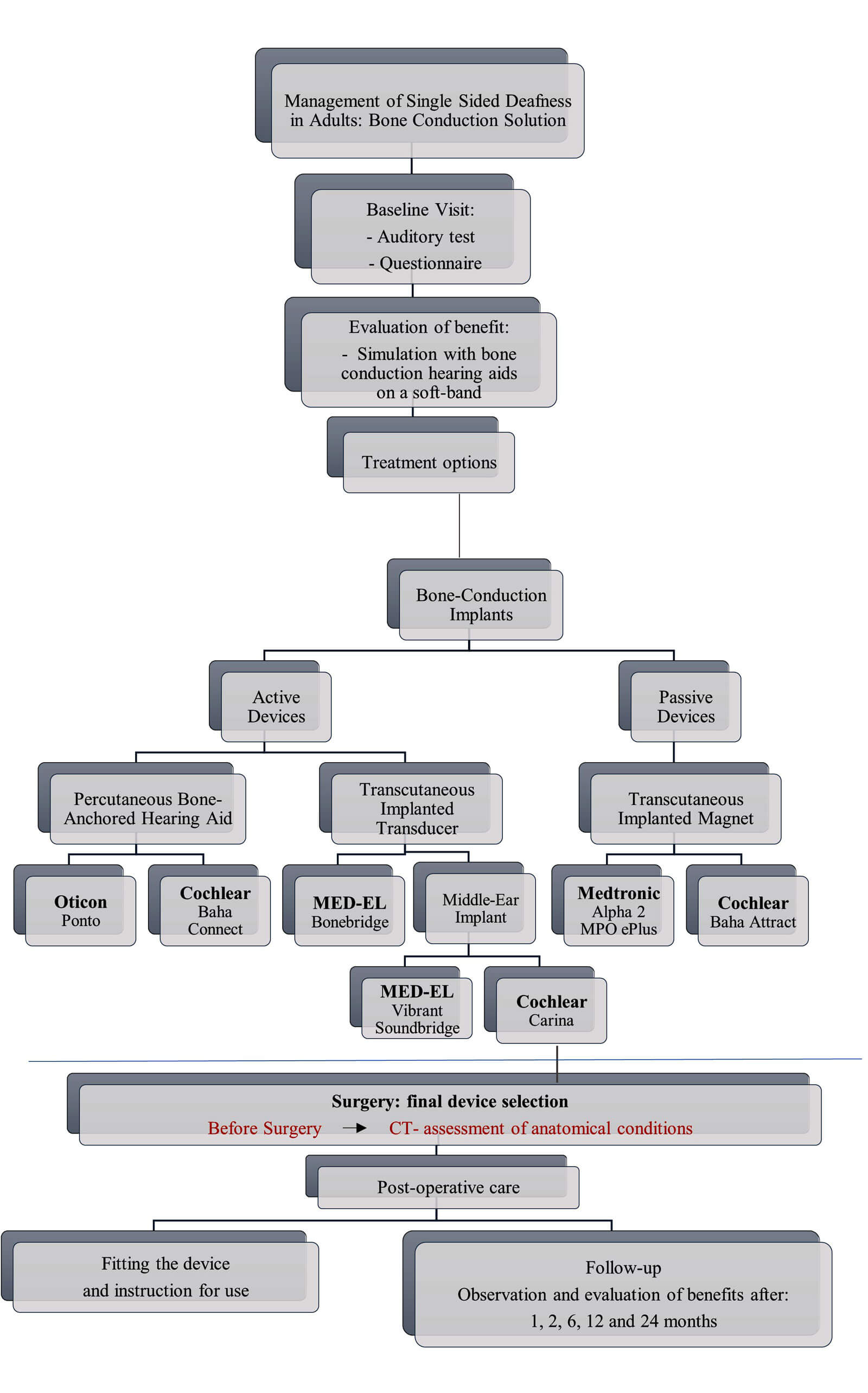 A number of implantable devices are now available to achieve bone vibro-conduction in people with unilateral deafness. These devices rely on effective and direct transmission of sound to the cochlea via vibration of the skull (bypassing the outer and middle ear). Bone conduction solutions are generally divided into passive and active implants, and are either percutaneous or transcutaneous. Figure 1 shows a flowchart leading to a suitable bone conduction implant.
