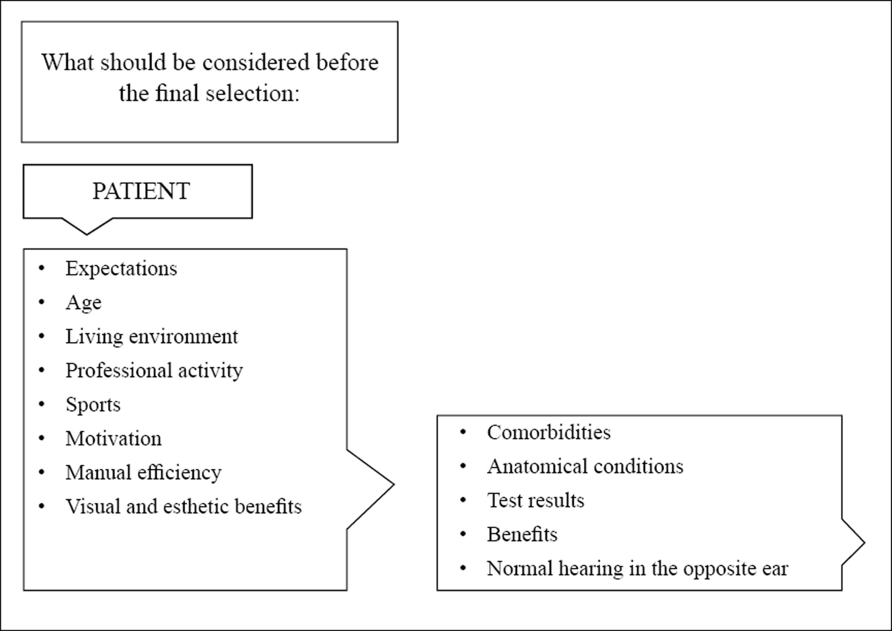 As shown in Figure 2, other candidate criteria include patient characteristics such as age, cause of hearing loss, time of onset of the deficit, and comorbidities. Additional factors are audiological profile, the attitude of the patient, and their expectations.