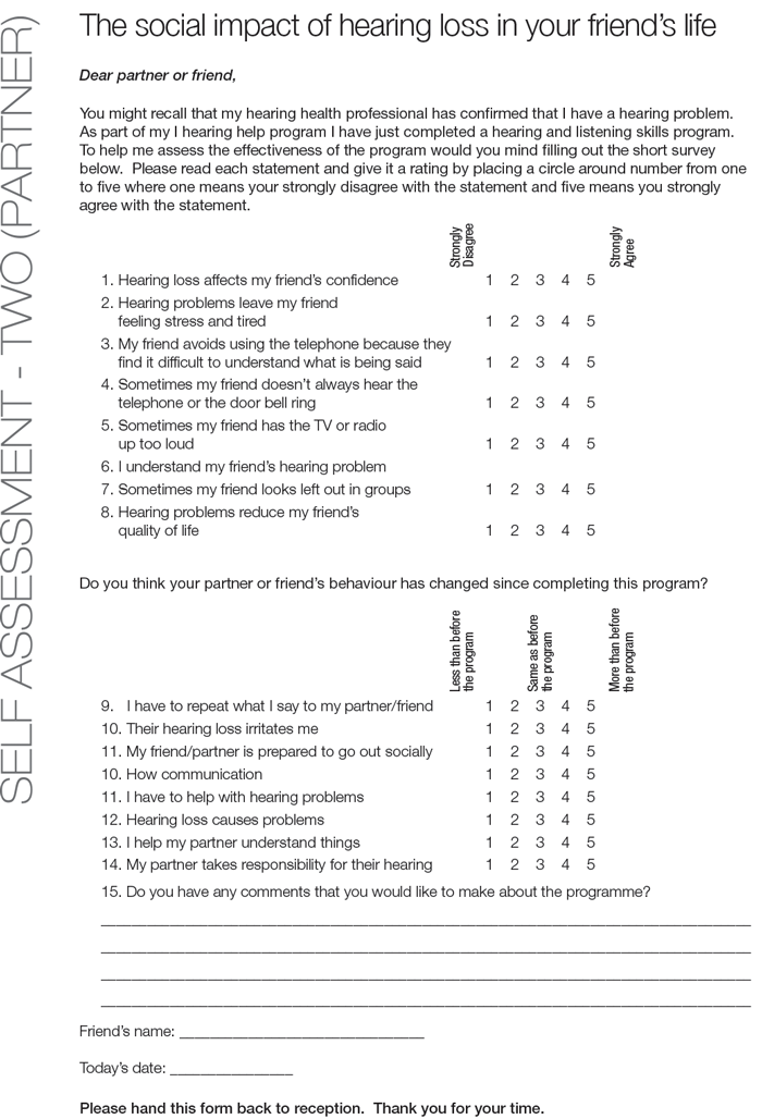 From an evaluation perspective, these first seven questions provide information that assists with process evaluation. Process evaluation tells us what it is about our intervention that is associated with the change process. The use of these forms enables the monitoring of a range of change processes. A partner might realise, for example, how hearing impairment impacts on the client, and in turn support them more in difficult social settings. Effective rehabilitation may also enable the client to gain coping skills to manage their hearing impairment and as such feel more confident in social settings. Clients may come to realise that they are more left out of social settings than they realised or begin to notice people complaining more. These are positive outcomes, even if the scoring of the item seems negative.