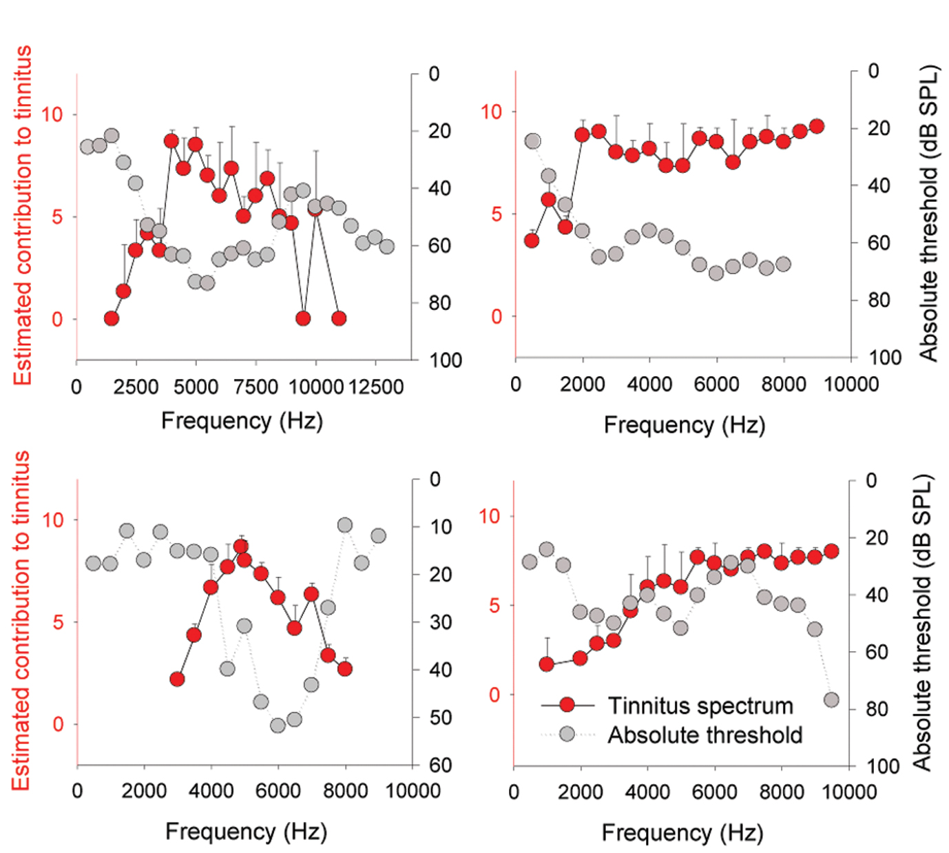 Figure 1: Data replotted from [9] showing absolute thresholds (grey circles, right y-axis) and estimated contribution of different frequency components to the tinnitus sensation (red circles, left y-axis). The error bars show ± one standard error.