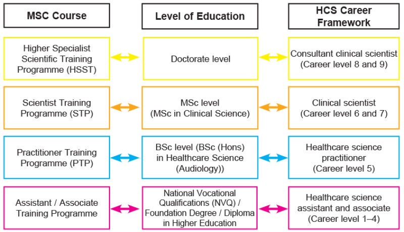 In 2011, three universities in the UK were accredited to offer the BSc (Hons) in Healthcare Science (Audiology (Practitioner Training Programme (PTP)) degree and two to offer the MSc in Clinical Science (Scientist Training Programme (STP)). A further five universities were accredited to offer the PTP degree in 2012. The curricula for the Healthcare Science Assistant and Associate, as well as for the Higher Specialist Scientific Training programme (HSST), should be available in 2014/2015. We will now consider the structures of the PTP and STP as specified by the MSC curricula (see weblink 2).