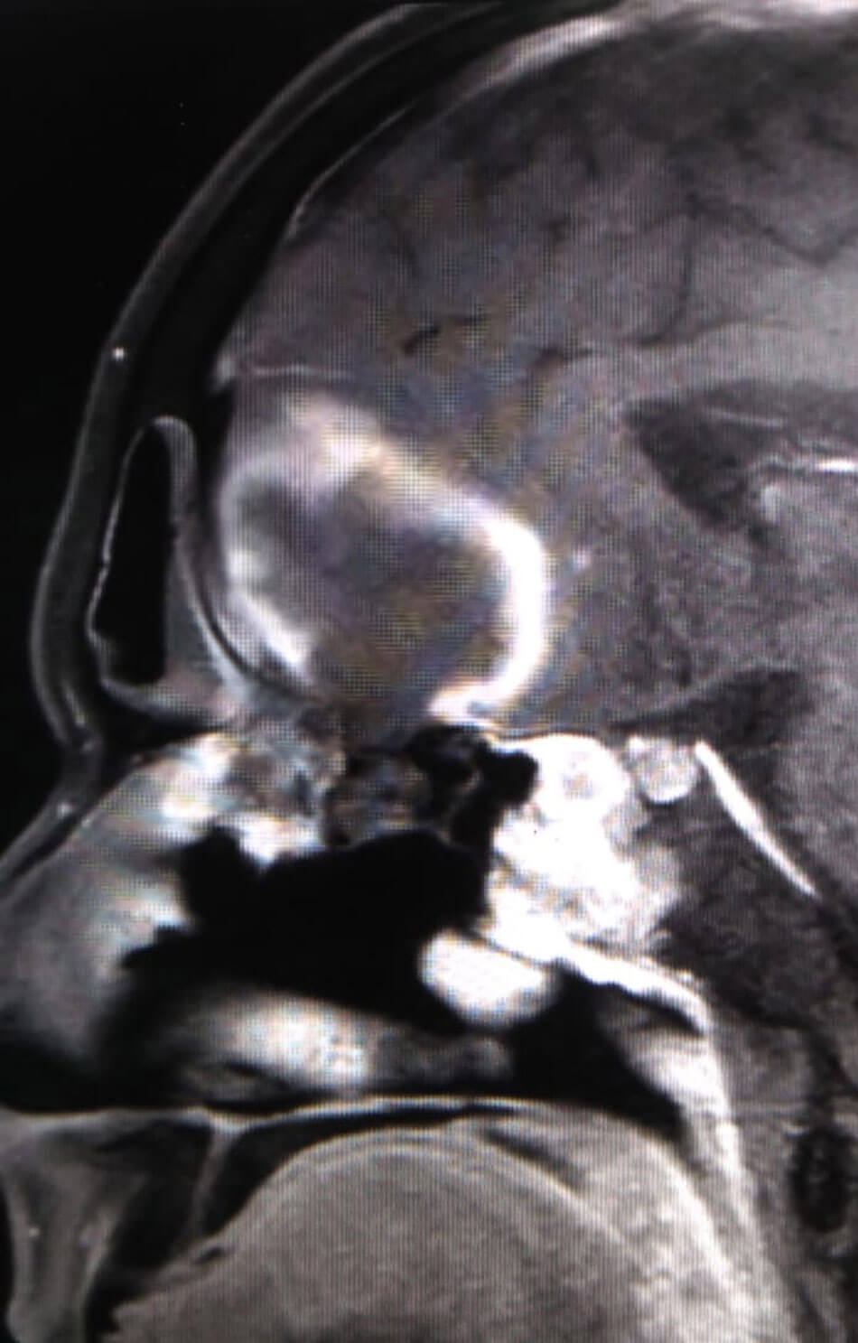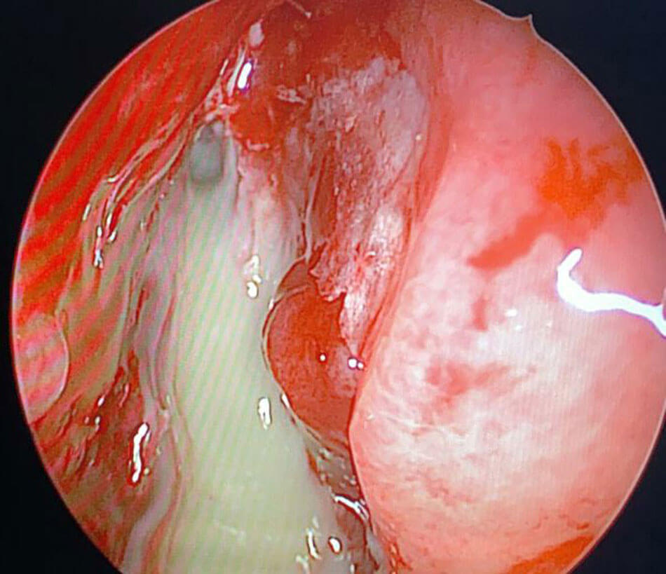 Endoscopic view of pus drained from a frontal lobe abscess through the cribriform plate.