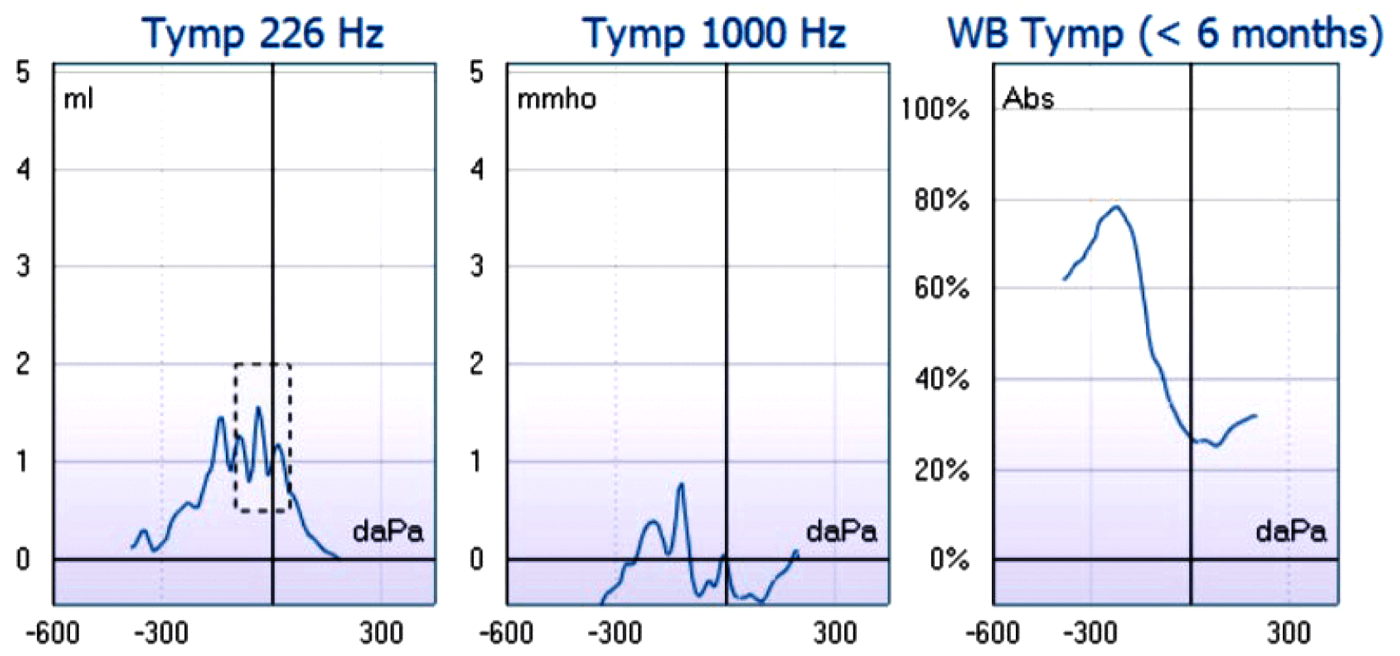 Measuring the status of the middle ear in patients with pressure equalisation tubes (PE tubes) is not possible with traditional 226Hz tympanometry. When a PE tube is placed in the tympanic membrane, a tympanogram will show a flat curve, and the equivalent ear canal volume reading is expected to be larger than that of the ear canal of the patient. This method does not provide the clinician with any information regarding the middle ear function, with the exception that it is assumed that the PE tube is open.