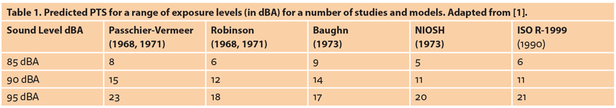 The ISO model is considered accurate enough for use by regulators and administrators to make policy suggestions for workers but group results should not be used when an individual is considered [1]. Table 1 shows the predicted permanent hearing loss for several levels of noise exposure for a number of studies.