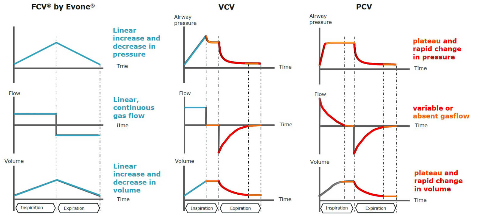 Figure 2. FCV has linear pressure, flow and volume changes in inspiration and expiration. Both VCV and PCV have variable flow and volume changes, periods with no flow and rapid pressure drops especially in exhalation.