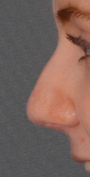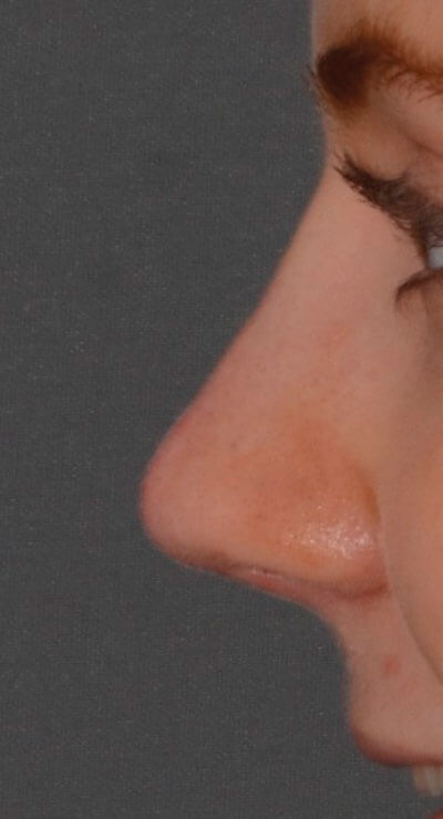 A HA filler is injected at the radix and bony dorsum and massaged into a fan shape, narrowing caudally towards the dorsal hump. The purpose of this point is to raise the level of the radix to the upper lash line. The second area of injection is caudal to the hump prominence. The filler may be gently massaged to lead gently into the lower third of the nose. Finally, a small volume of HA is injected at the two light reflection points of the tip. This volume is highly variable, typically 0.05-0.1ml, and depends on the shape of the tip and the response of the soft tissues to the filler injection. These injections help to raise the tip slightly giving a very mild supratip break. Figure 1 shows the profile of a young female patient before and after injection of HA.