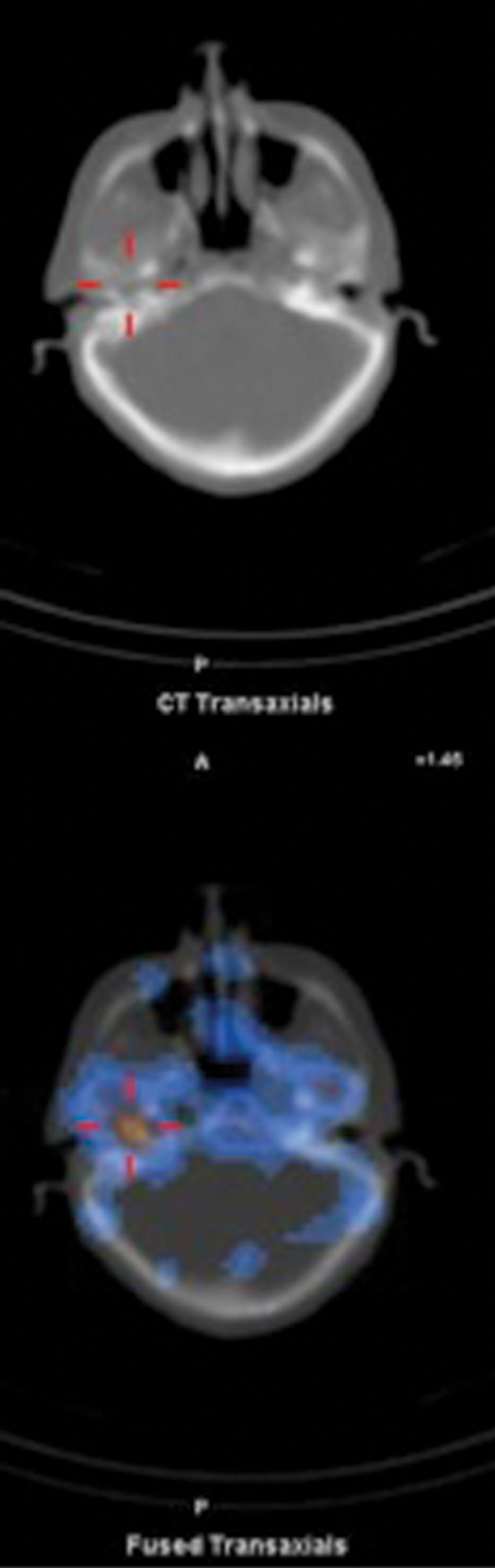 Figure 1: Axial CT and fused Indium-111 labelled white cell SPECT / CT images demonstrate abnormal accumulation of radio-labelled white cells localised to the right petrous temporal bone in a diabetic patient with SBO. Follow-up scan in six weeks post commencement of treatment showed persistent abnormal activity and a decision was made not to discontinue antibiotics. A repeat scan three months later showing no abnormality confirmed resolution.